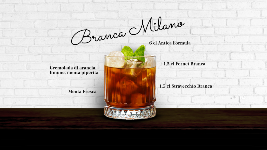 BRANCAMILANO è realizzato con un cuore composto dei tre prodotti icona dell’azienda: 1,5 cl Fernet-Branca, 6 cl Antica Formula e 1,5 cl Stravecchio Branca.